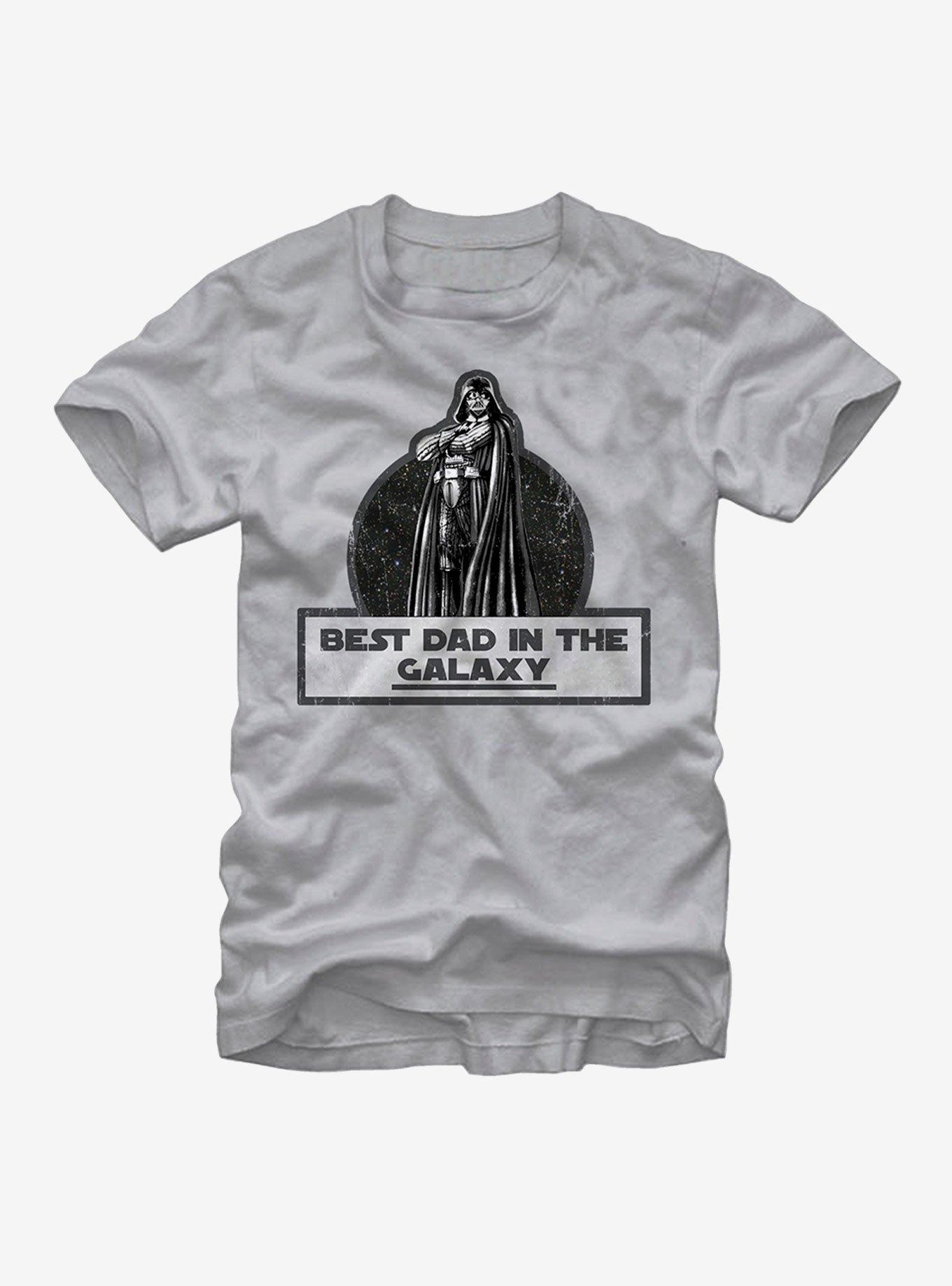 Meet the Sith Lord who is holding down the number one spot for father of the year with the Star Wars Vader Best Dad in the Galaxy Silver T-Shirt! This durable light gray shirt reads "Best Dad in the Galaxy" next to Darth Vader making it the perfect gift for the epic father in your life. 100% Cotton.