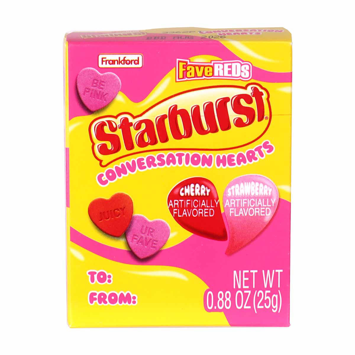 - Single box containing 0.88 oz of Starburst Fave Reds Conversation Hearts
