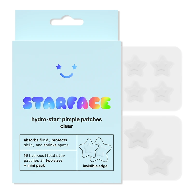 HYDRO-STAR 32 CT CLEAR. Benefits: Hydro-Stars are made with 100% hydrocolloid to help reduce the appearance of inflammation and shrink spots overnight.. Hydro-Stars are perfect for all spots, especially juicy ones like surface-level pimples and whiteheads. Thanks to hydrocolloid's gentle properties, wearing Hydro-Stars just for fun is also safe (and encouraged!).. These clear stars shield your spots from outside bacteria and serve as a gentle reminder to avoid skin picking.. Dermatologist tested, and safe for every skin type, including sensitive.. Features: Perfectly shaped to grip the contours of the face, Hydro-Stars are designed to really stick and keep you feeling cute while caring for your skin.. Rounded, invisible edges are great for reaching spots in tight or awkward spaces, like the corner of your nose or side of your lip.Perfect for when you're feeling more lowkey.. Have double the fun with two sizes: 16 classic (14mm) and 16 big (18mm).. Take your stars everywhere you go with Big Yellow, a reusable, mirrored compact (sold separately) that holds your patches for easy application and storage.. Key Ingredients: Hydrocolloid is clinically proven to improve the appearance of pimples overnight: It draws out fluid, which can help soothe redness and inflammation..