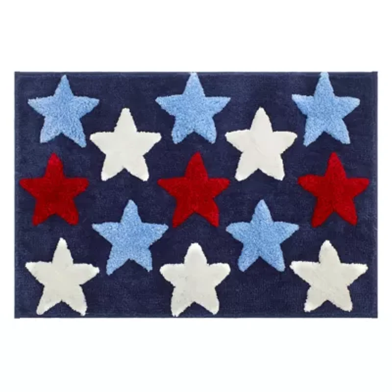 The Avanti Stars Decorative Rug features 4 rows of offset red, white and medium blue stars tufted over a navy blue ground. The rug is finished with a matching navy blue taped edge. The rug is made of 100% polyester for quick drying, super soft feel and brilliant color. Measures 20" x 30" with a non-skid, latex back. A great way to add a patriotic touch to any bathroom, entryway or kitchen. 1-Piece Novelty Imported Product Specifications 20-in. x 30-in. Material & Care Polyester Machine washable, gentle cycle