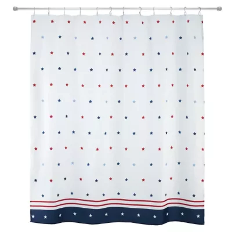 The Avanti Stars Shower Curtain features offset rows of red, navy blue and light blue stars on a bright white ground. The curtain is finished at the bottom with two thin red stripes and a wide navy stripe with white stars. Made of 100% polyester for a soft feel, easy care and brilliant color reproduction. Measures 72" x 72". A subtle way to add a touch of red, white and blue to your bathroom. 1-Piece Novelty Imported Product Specifications 72-in. x 72-in. Material & Care Polyester Machine washable, gentle cycle