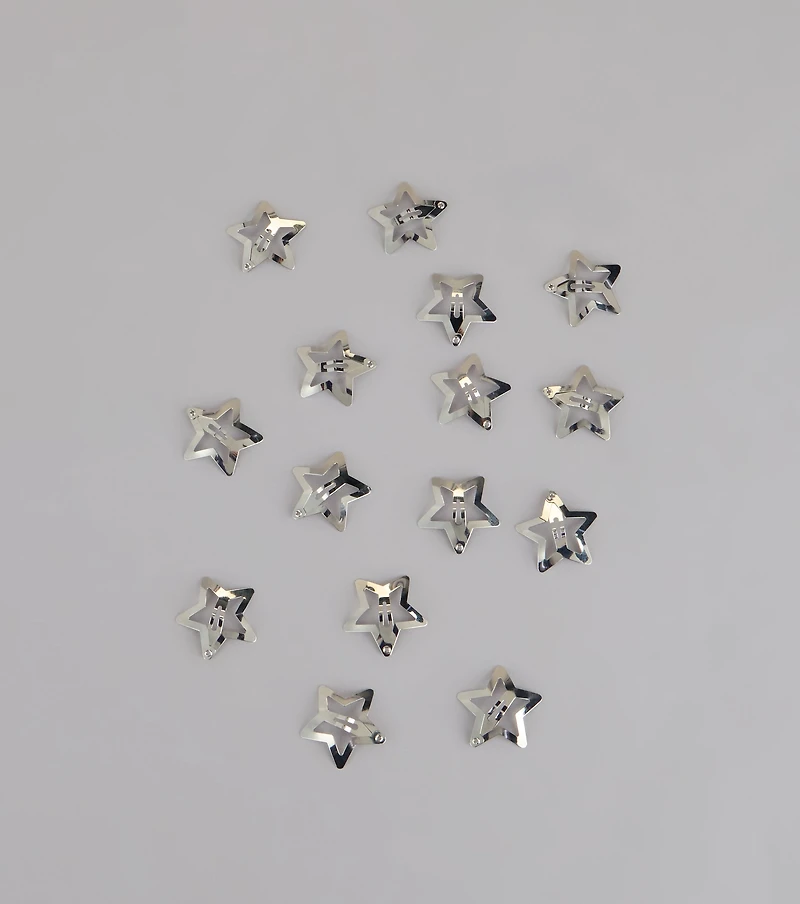 Hair that catches the light, no extra effort required. This star hair clip set is made for festival days, late nights, and every outfit that needs a little shine. Fit & Features 15-pack hair clip set Metal material Star outline shape Snap clip design