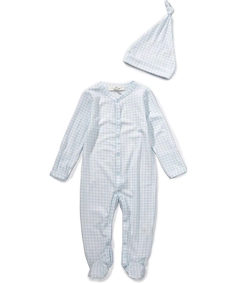 From Starting Out, this coverall features: Allover gingham print Round neckline Long sleeves Fold over cuffs to prevent scratching Snap front full Footed Matching knot hat Polyester/rayon/elastane Machine wash/tumble dry Imported.