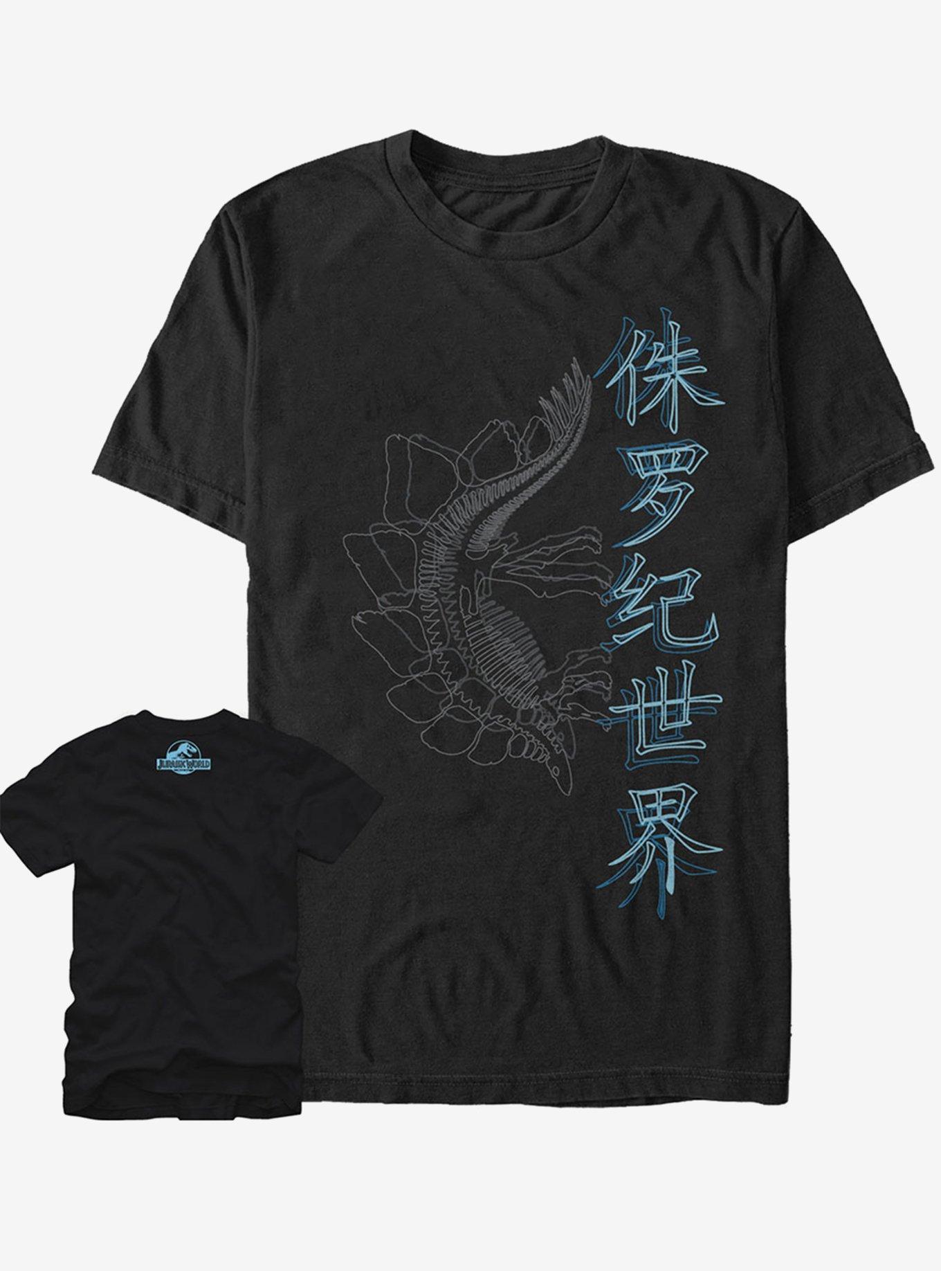 No bones about it, dinosaur fans are loving the Jurassic World Stegosaurus Fossils T-Shirt! A stegosaurus skeleton is printed next to a series of Japanese characters on this durable dino shirt, with the Jurassic World logo printed on back.