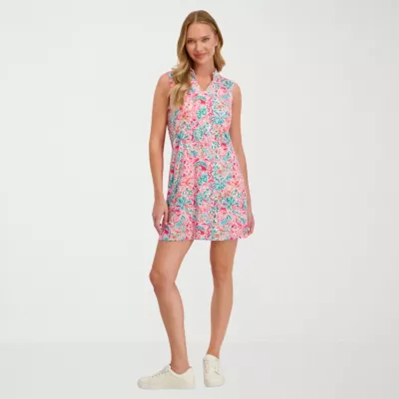 The Stella Parker Sleeveless Ruffle Neck Dress brings a feminine touch to performance-ready style. Made from stretch fabric with 92% polyester and 8% spandex, it offers lightweight comfort, flexibility, and UPF 50 sun protection. A delicate ruffle neckline, piping, and front pockets combine to create a flattering, functional silhouette. Pair it with white sneakers for a clean, elevated look that moves effortlessly from course to casual.