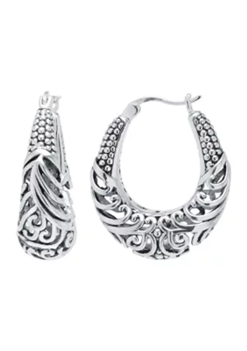 These sterling silver earrings by Infinity Silver come with a click-top closure and classic Filigree hooped design. Click-top closure Oxidized finish Imported Product Specifications 0.98 in L x 0.35 in W Material & Care Sterling silver Clean with a soft cloth