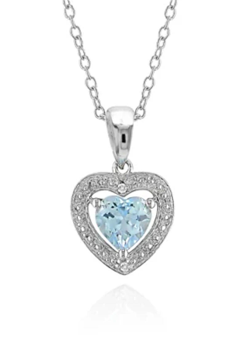 This sterling silver pendant features a 1.00 ct. t.w. heart shaped blue topaz with 0.01 ct. t.w. diamond accent and measures 17.50-mm in length and 11-mm in width on a 18-in. chain. Almost all gemstones have been treated to enhance their color and require special care. Prong setting 1 Blue Topaz and 2 Diamonds Imported