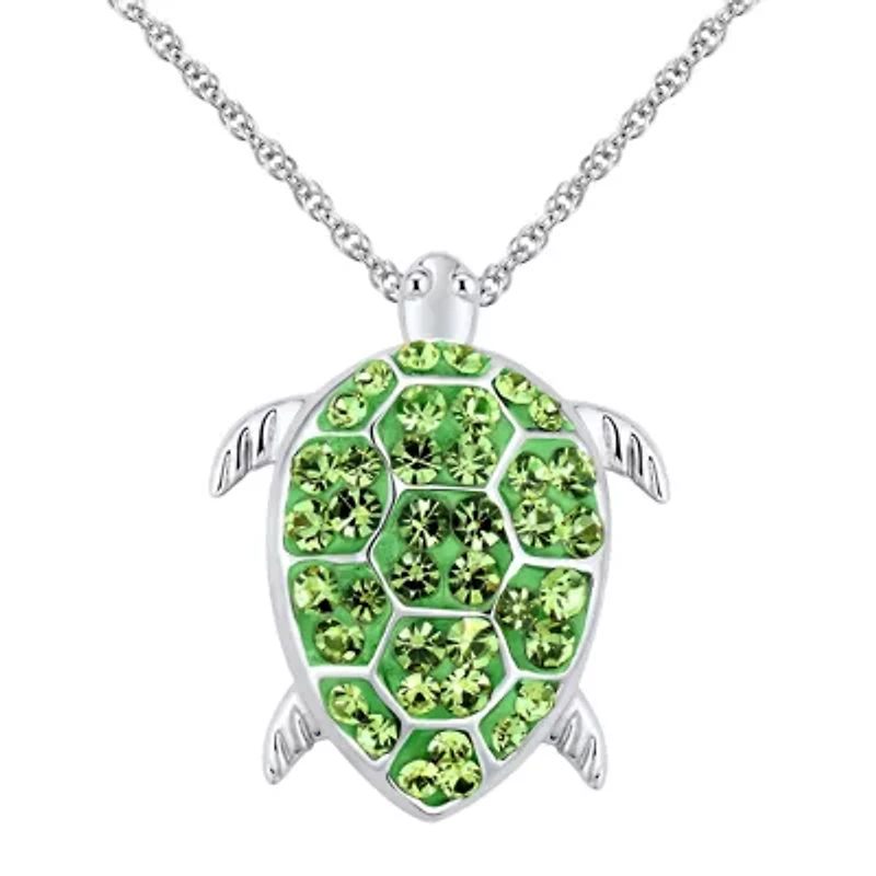 Cute as can be, this sterling silver turtle pendant is covered in green crystals for an eye-catching pop of color that brightens up any outfit.