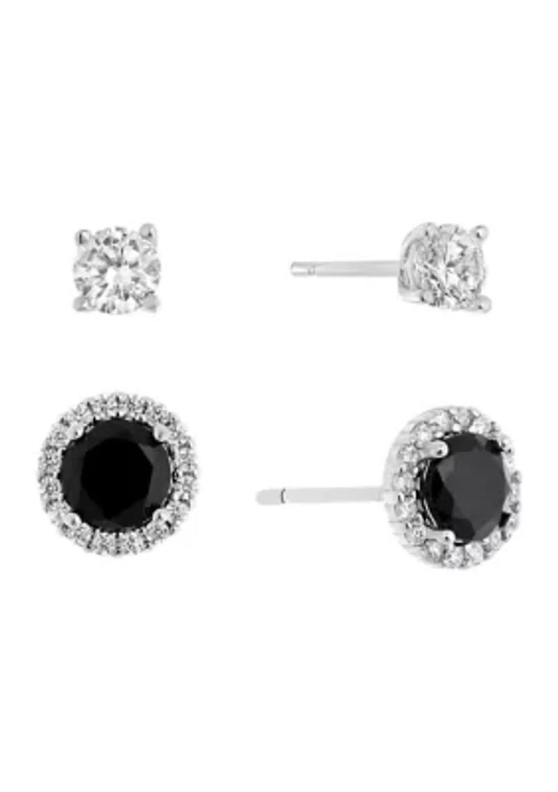 This stunning sterling silver earring set features a 7mm black cubic zirconia halo stud and a 4mm clear cubic zirconia stud. A perfect set of earrings for your collection. 36 Cubic Zirconia Post back earring Polished finish Imported Belk Exclusive Product Specifications 0.15" x 0.15"; 0.3" x 0.3" Material & Care Sterling silver Clean with a soft cloth