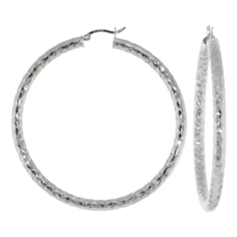 Classic look, contemporary style, these sterling silver hoop earrings have an edgy diamond-cut style that can work during and after office hours.