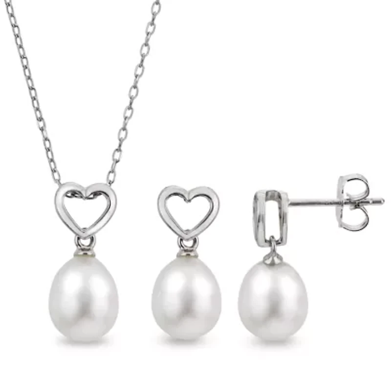 This lovely two-piece pendant and earring set features a sweet sterling silver heart motif adorned with gleaming white 7-8mm oval shape cultured freshwater pearls. Ideal for gift giving. Post back, Spring ring clasp Polished finish Imported Product Specifications 0.0000 Material & Care Sterling Silver Metal, Sterling silver Clean with a soft cloth.