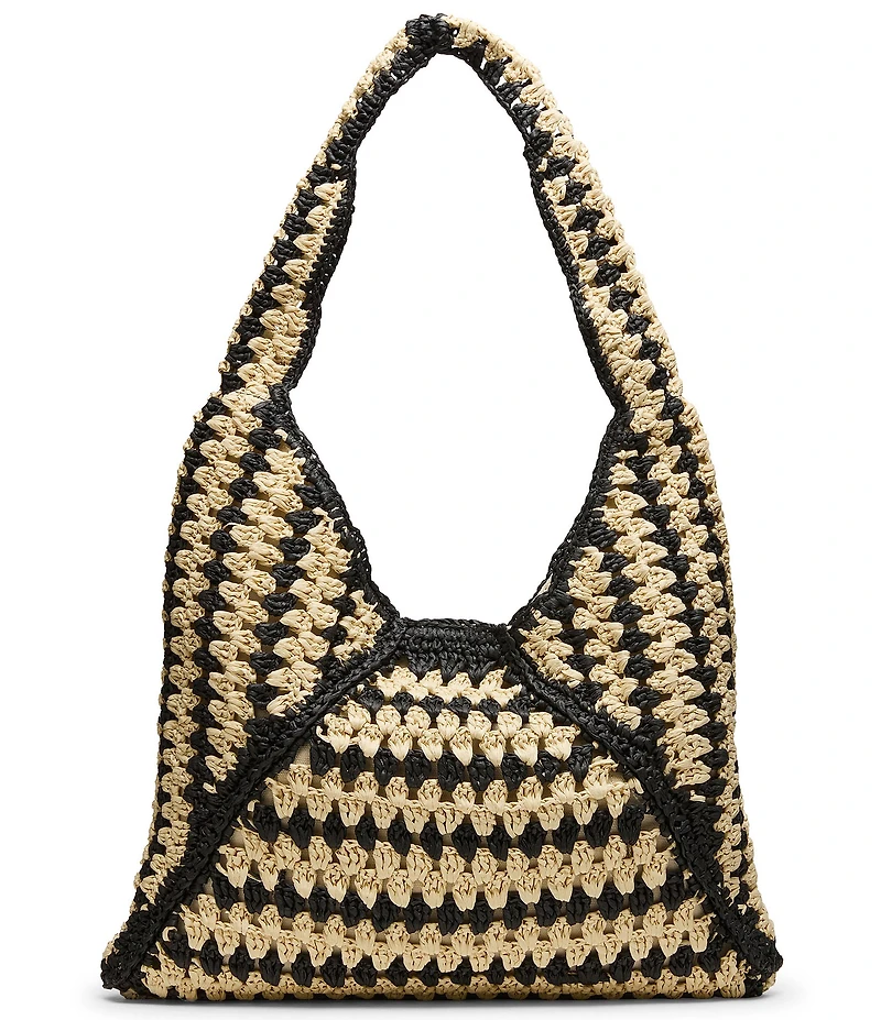 From Steve Madden, this hobo bag features: Straw exterior Nylon lining Magnetic snap closure Interior back wall zipper pocket Shoulder strap approx. 22" drop Approx, 14.5" L x 2" D Imported.