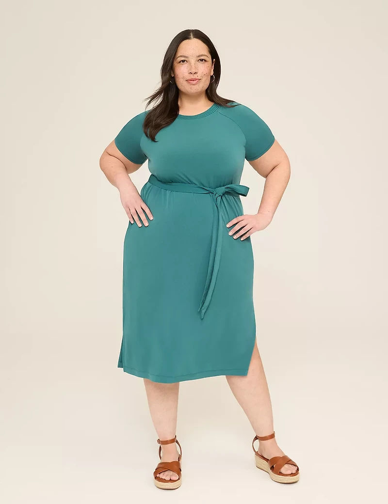 Available in Plus Size THE 24/7 dress you need for this summer - super-soft Matte Jersey, a custom-cinch belt, special stitching and versatile style possibilities at an unbeatable price. FIT: Fit & Flare. Universally flattering silhouette with a classic fit bodice, fitted waist and flared skirt. Front Length (On Body): 47" (hits mid to lower calf) Midi length FEATURES: Crew neck Short raglan sleeves Matching self-tie belt with loops Pockets Single button keyhole back closureSPECIAL DETAILING: Stitch detailing along neckline, sleeves and belt FABRIC: Matte Jersey. Super soft & comfy, but also structured enough that you'll still feel pulled together at the end of your day. Machine Wash 95% Polyester/5% Spandex Item Number #411883 Imported Plus Size Dress ". Plus Size Stitch-Detail Tie-Waist Jersey Midi Dress, in Teal, 22/24, Women's, Lane Bryant