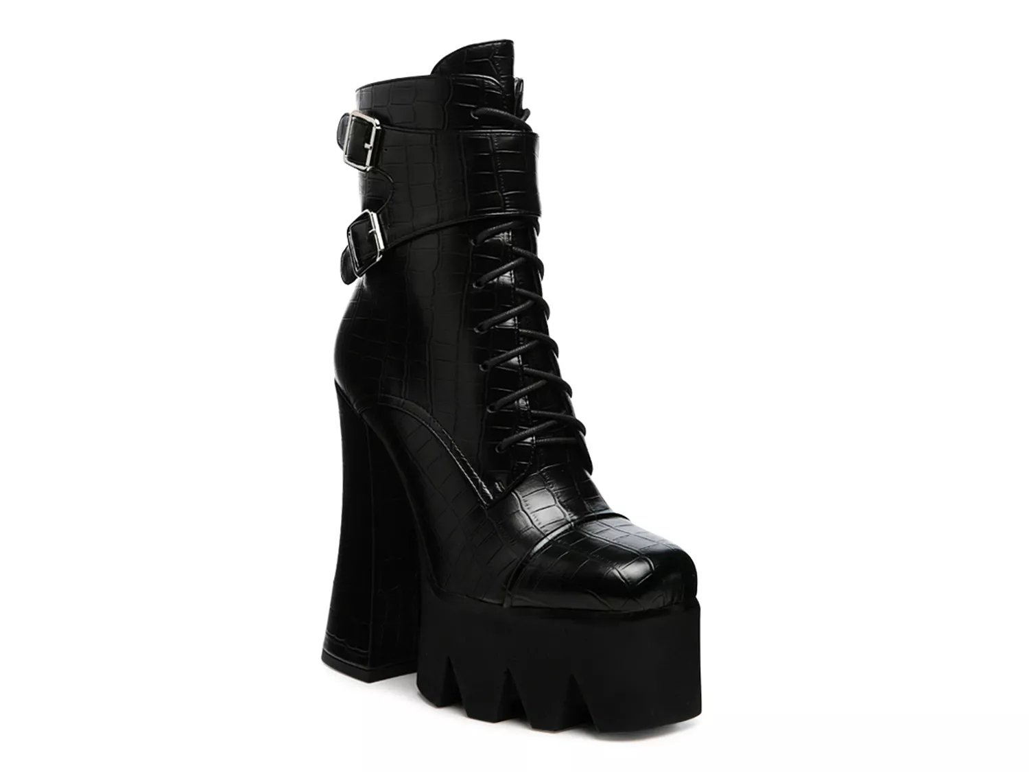 Look captivatingly edgy in the Stomper combat boot from London Rag. The croc patterned upper, sky high heel and buckle details inspire trendy styling and looks.