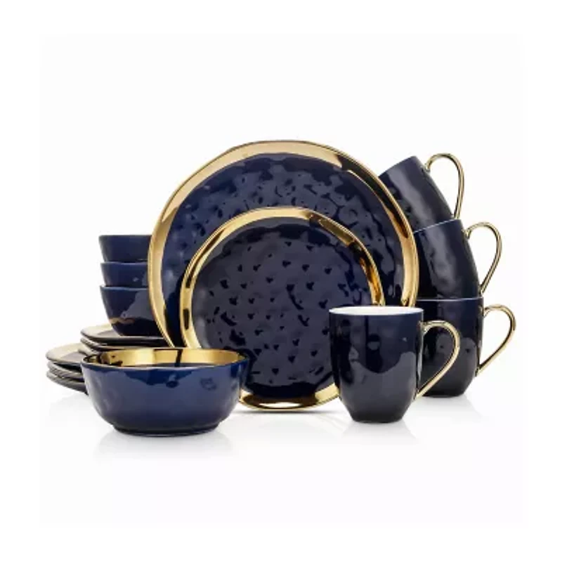 Serve up glamour when you set the table with Florian, Stone Lain's 16-piece porcelain dinnerware set. The round plates and bowls feature organic edges�all with a bold gold trim�and a pebbled texturing that creates a sense of fluidity and flow to your design. Complete with service for four, the collection includes 4 dinner plates (10 inches), 4 salad plates (7.5 inches), 4 bowls (4.5 inches), 4 mugs (12 fl. oz.).