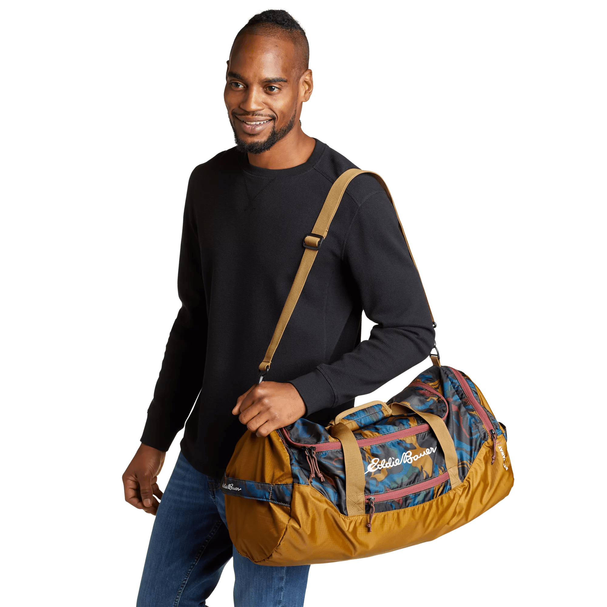 Ultralight, packable duffel in 200-denier ripstop polyester is ideal for travel or for use as a gym bag. The 45-liter capacity includes a zippered shoe garage and a trolley-handle sleeve for sliding onto your rolling luggage. Packs into one of its end pockets when not in use.