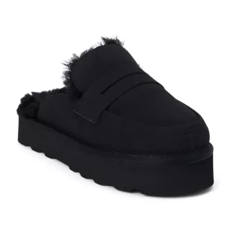 Vegan faux fur-lined penny loafer style mule. Slip-on China Imported Product Specifications 1 in 1 in B Material Faux Suede