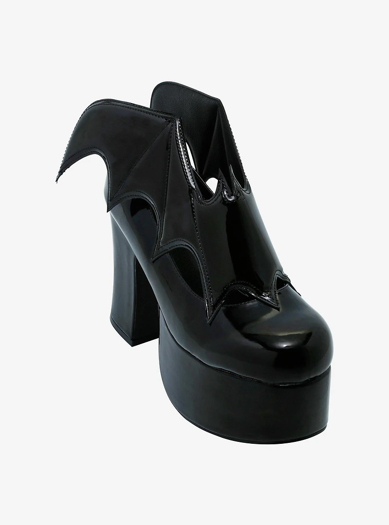 We're going batty over these witchy heels! These black platform heels feature shiny bat appliqué detailing around the front. Listed in women's sizes.