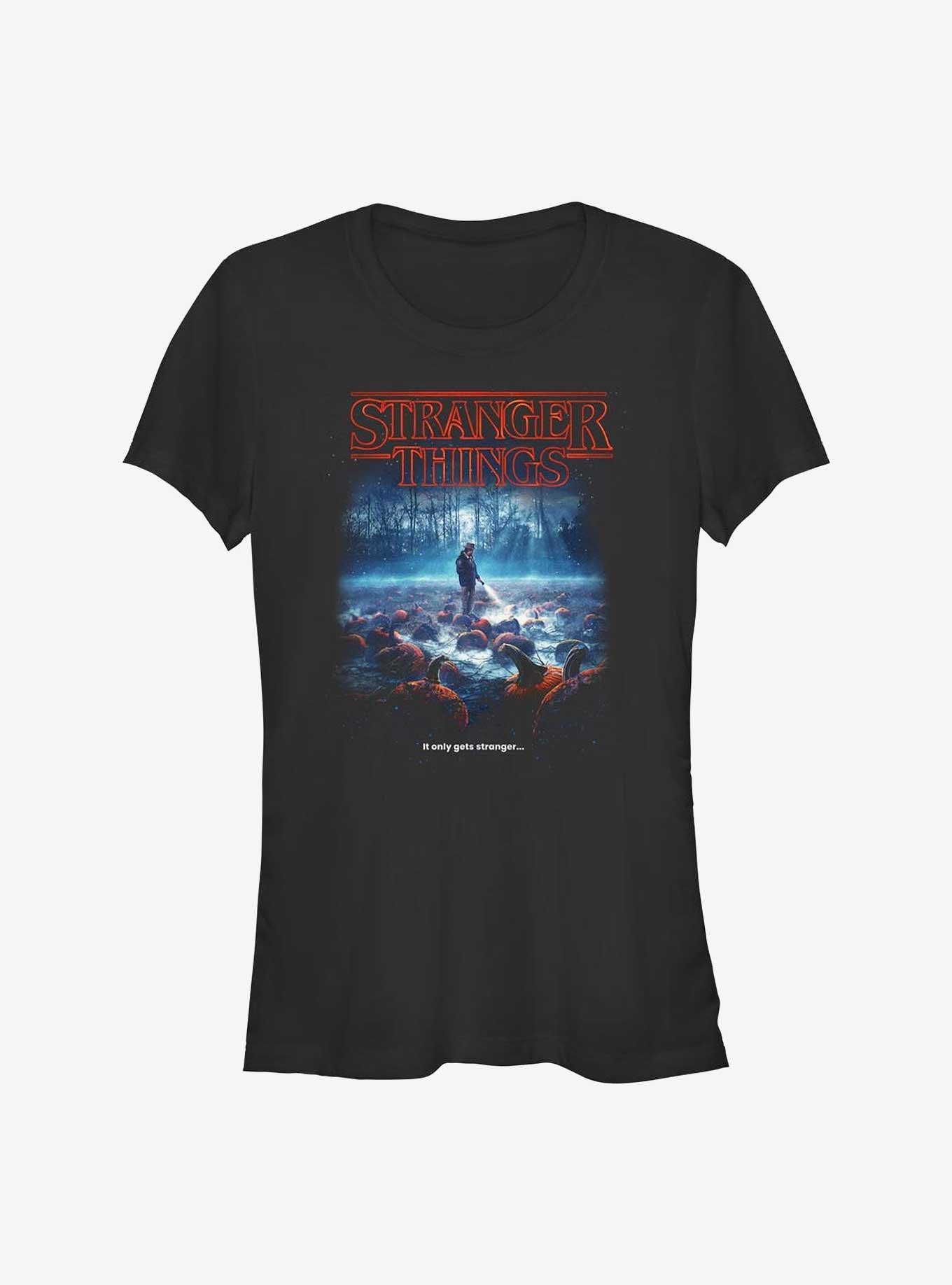 Did Eugene poison the pumpkins on Merrill's farm? Hopper's on the case! This fitted, lightweight black tee -- inspired by Stranger Things 2 -- features a series logo above an image of Jim Hopper investigating Merrill's Pumpkin Patch, with "It only gets stranger..." verbiage below.