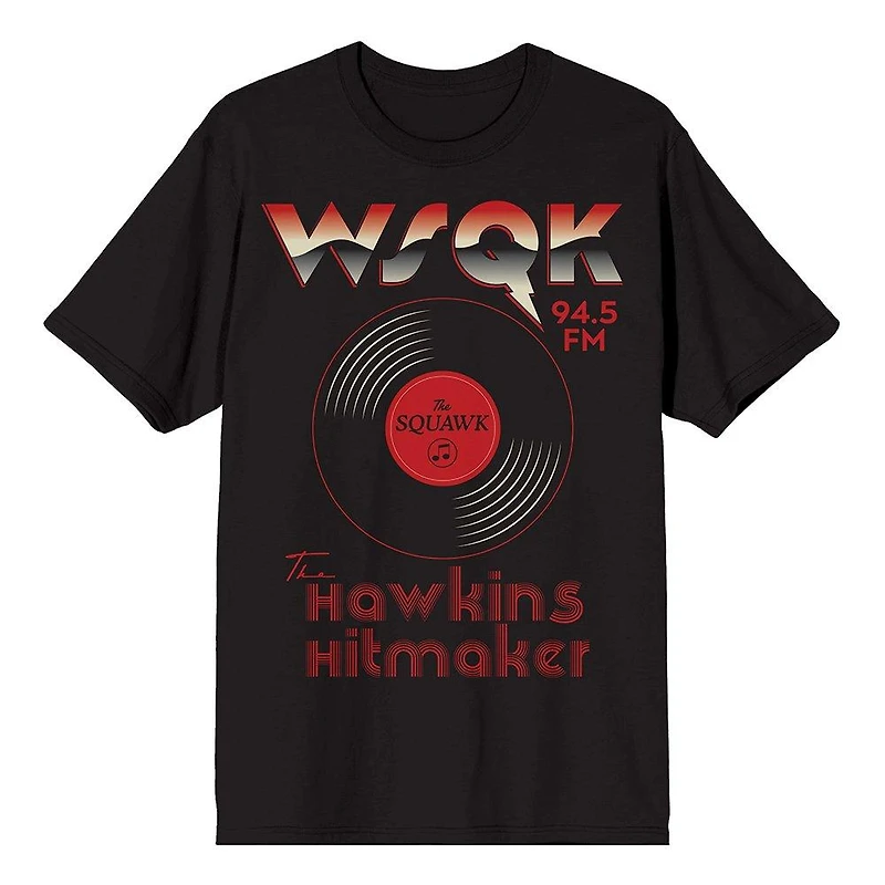 The Stranger Things WSQK Radio Station Record Graphic T-Shirt channels the retro-’80s vibe of Stranger Things with a vintage radio-station “WSQK 94.5 FM The Squawk” design printed across the front. Soft, comfortable, and casual — it’s a great way for fans to show their love for Hawkins and its in-universe radio station, whether you’re binge-watching or just out and about.