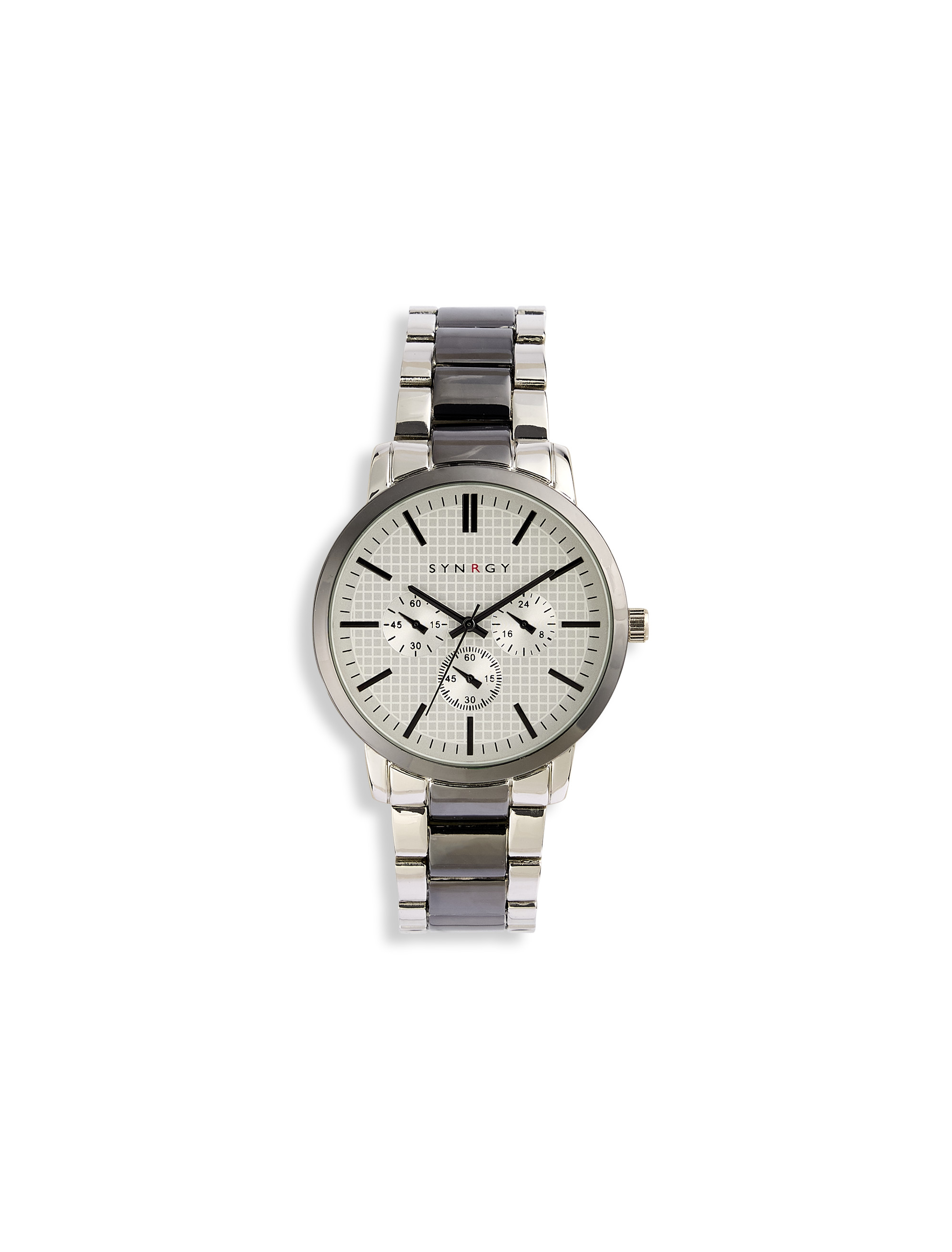 Designed at DXL for Big and Tall guys, this watch features a little something extra! The classic design proudly showcases a silvertone and gunmetal stainless steel watch. Plus, it includes a set of four bracelets with black beaded, silver chain, silver cuff and black woven patterns. It even comes with a handsome presentation box too, making it a great gift!