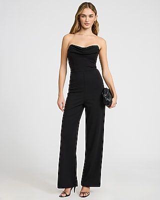 A chic strapless jumpsuit with a draped neckline and a classic wide leg shape. Perfect for holiday occasions, date nights, or your dressed up events.