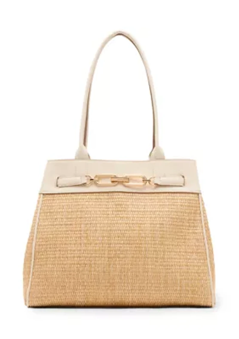 Add a touch of elegance to any look with this Anne Klein tote bag. Its unique straw design offers a chic vibe that effortlessly elevates any outfit. Set of 2 9.6" handle drop, 24" strap drop Convertible strap Exterior: gold chain link hardware, additional pouch Interior: one zip pocket, two slip pockets Imported Product Specifications 11" H x 13" L x 7.1" D Material & Care Self-color stitch trim PVC Clean with a damp cloth or soft brush