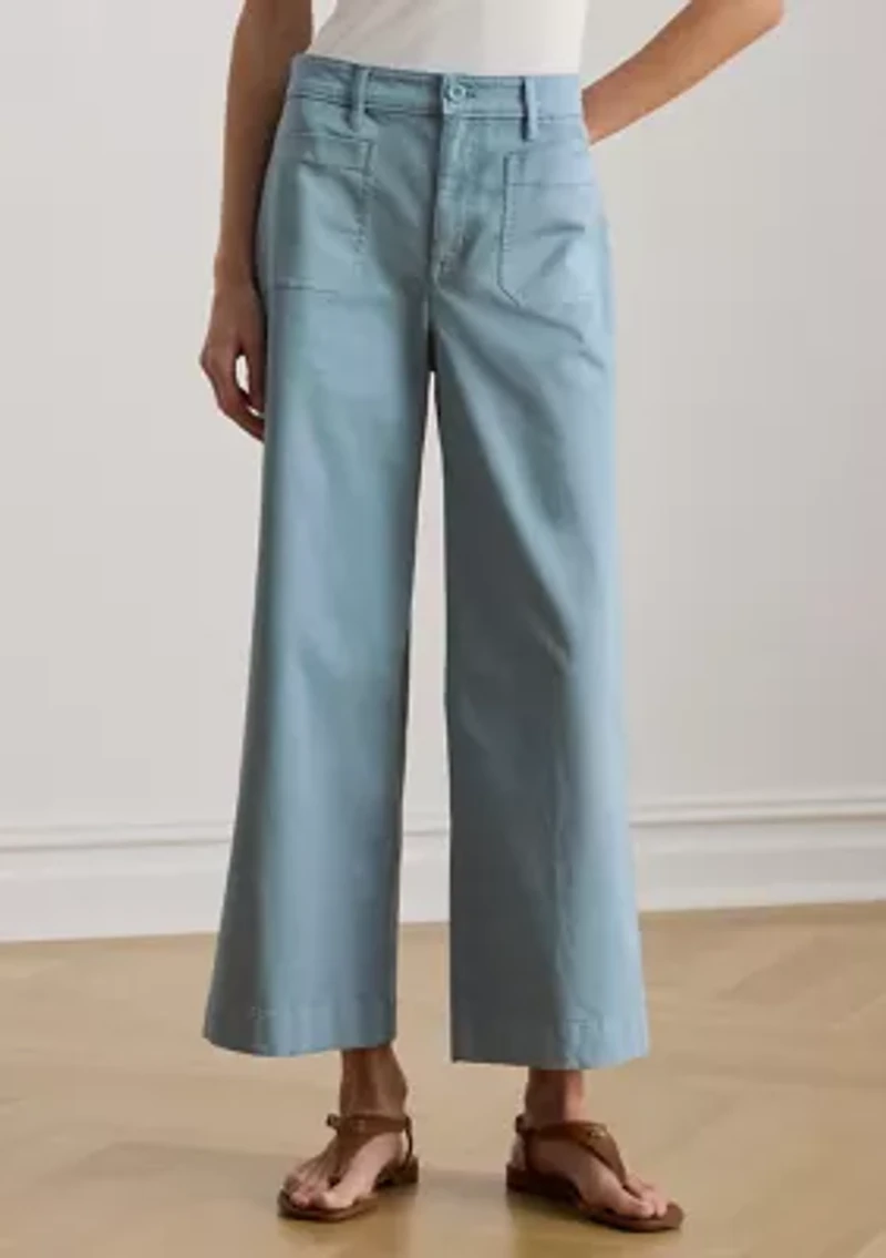 Crafted with stretch cotton chino, these chic pants feature a high rise and wide-leg, cropped silhouette. High-Rise Wide-Leg Cropped: sits above the natural waist Fitted through the hip with a relaxed thigh and a wide, cropped leg US size 8 has a 12.25" rise and a 24" leg opening All sizes have a 26" inseam Belt loops Zip fly with a signature buttoned closure “Lauren Ralph Lauren”–engraved corozo button Two front waist patch pockets Two back waist patch pockets Double back waist darts Model is 5'10" (178 cm) and wears a US size 4 By choosing Lauren Ralph Lauren's cotton products, you’re supporting the investment in the Better Cotton™ mission to help cotton communities survive and thrive while protecting and restoring the environment. This product is sourced via a system of mass balance and therefore may not contain Better Cotton™. Visit bettercotton.org/mass balance for more information about mass balance. Imported Material & Care Cotton, elastane Machine washable
