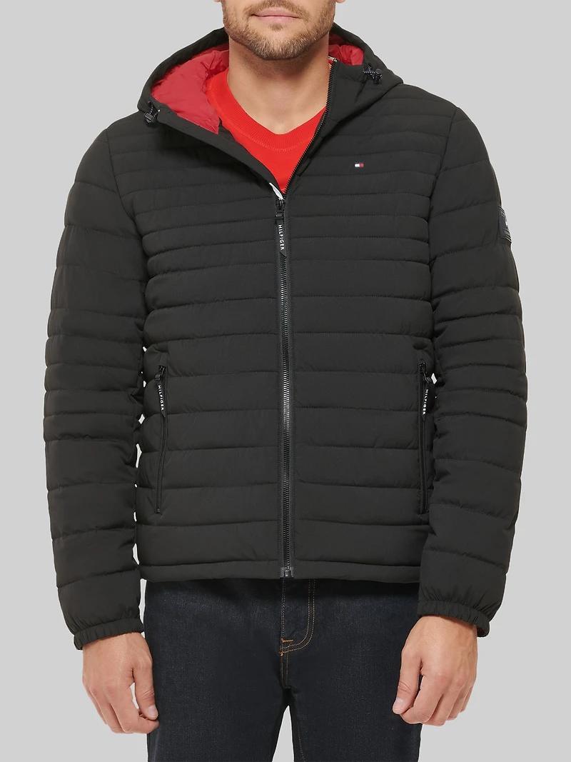 Experience supreme warmth and unrestrained movement with this Tommy Hilfiger hooded puffer. This jacket features a performance-driven stretch shell that eliminates the rigid feeling of typical cold-weather gear, ensuring total comfort and flexibility during wear. The quilted construction efficiently holds its insulating fill, trapping body heat to deliver reliable warmth without unnecessary weight. Complete with an attached hood for protection against unexpected weather and Tommy Hilfiger's iconic detailing for an enduring look, this puffer is a practical, durable essential perfect for your daily adventures.