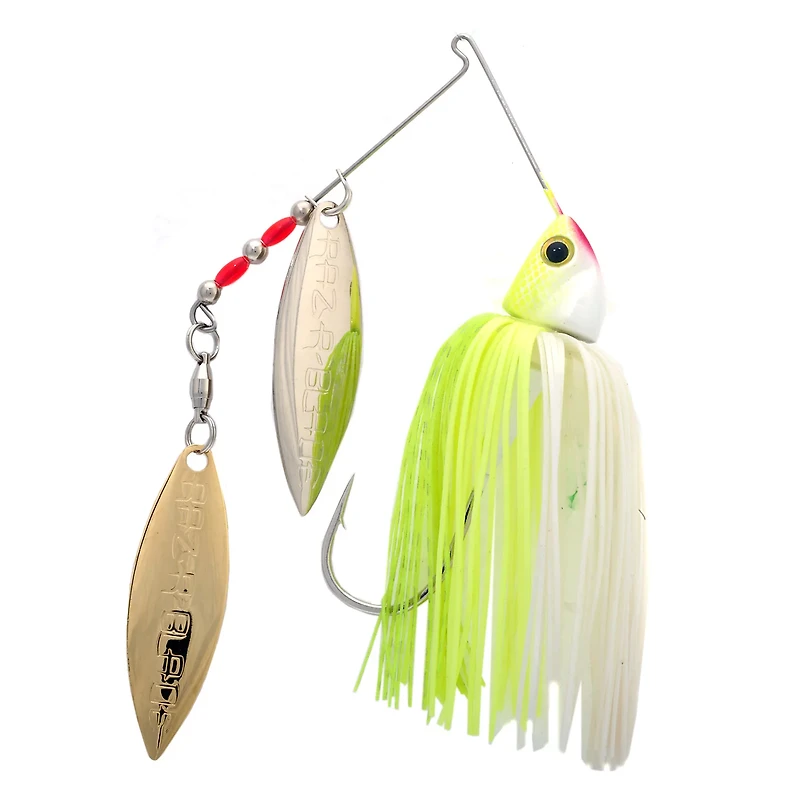 Fish won't be able to resist the Strike King Burner 3/8 oz Double Willow Blade Spinnerbait. The compact, minnow-shaped head is designed for speed and flash, and Raz-R-Blade high-rpm blades keep the bait down and level to prevent the blades from blowing out. The Perfect Skirt helps attract bites, and the Gamakatsu hook secures your catch.