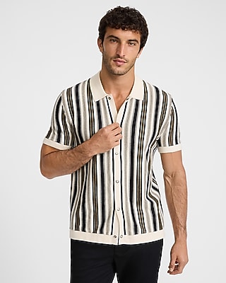 Perfect for layering in transitional weather, our trendy cotton short sleeve sweater polo is complete with vintage inspired vertical stipes, a classic point collar and a full button front.