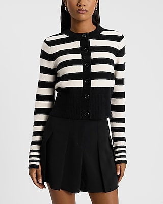 This cropped cardigan features a crew neckline, a full button front, long sleeves, and a ribbed hem. Plus, it is complete with a timeless striped pattern.