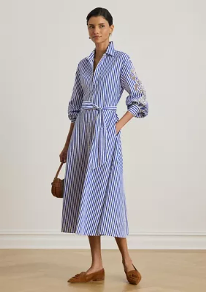 Tailored in lightweight cotton broadcloth, this Lauren Ralph Lauren belted shirtdress features yarn-dyed stripes and blouson sleeves detailed with feminine eyelet embroidery. Threaded belt loops, comes with a removable self-belt Long blouson sleeves with buttoned barrel cuffs, dropped shoulders, eyelet embroidery at each sleeve Collared neck Buttoned placket, buttons custom-developed with a “Lauren Ralph Lauren” logo Striped pattern Imported Product Specifications US size 8 has a 50.5" body length and a 32.75" sleeve length Dress length and sleeve length are taken from the center back of the neck Sleeve length changes 0.25" between sizes Model is 5'10" (178 cm) and wears a US size 4 Dress length changes 0.5" between sizes Material & Care Broadcloth fabric 100% cotton Machine washable