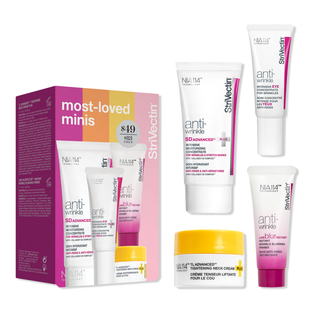 MOST LOVED MINIS 2023. Includes: SD Advanced PLUS Intensive Moisturizing Concentrate (1.0 oz). Intensive Eye Concentrate for Wrinkles PLUS (0.25 oz). Line BlurFector Instant Wrinkle Blurring Primer (0.25 oz). TL Advanced Tightening Neck Cream PLUS (0.25 oz). Benefits: SD Advanced PLUS Intensive Moisturizing Concentrate formulated to target Collagen to maintain skin volume, Elastin to prevent visible lines from forming, and Hyaluronic Acid to visibly plump skin.. Intensive Eye Concentrate for Wrinkles PLUS this moisturizing yet fast-absorbing formula targets all types of wrinkles around eyes crows feet (squint lines), under-eye lines and eleven vertical lines between brows (frown lines).. Line BlurFector Instant Wrinkle Blurring Primer instantly fill and blur the appearance of deep lines and creases to prevent makeup from caking into and magnifying the look of wrinkles.. TL Advanced Tightening Neck Cream PLUS This do-it-all formula visibly tightens, lifts, and firms while smoothing horizontal neck lines, plus corrects the look of vertical sleep wrinkles, crepey texture, and uneven skin tone on the dcollet.. Formulated Without: Parabens.