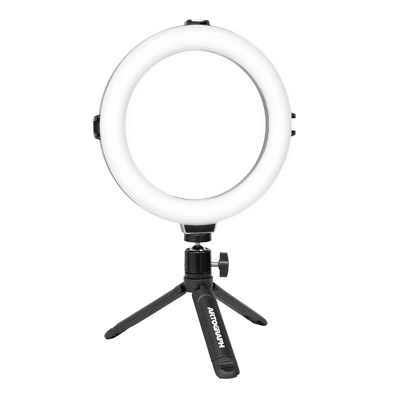 This eight-inch diameter ring light comes with every accessory you need to upgrade your workstation for virtual calls, video recordings, selfies and live streams. The height-adjustable desktop stand ensures a stable set-up, while the smartphone clamp and swivel ball gives you the option to take calls or record selfies with your phone. In addition to power controls on the USB cord, the Bluetooth remote makes operating the photography functions on your iOS or Android device easy.Details:8" (20.3 cm) ring light diameter3,200K to 6,500K color temperature rangeThree slots to mount phoneSpring-loaded phone clamp extends from 2" (5.1 cm) to 3.25" (8.3 cm)360º swivel ball mount with locking knobPowered by USB (9W/5V)79" (200.7 cm) power cordLegs extend to raise height to 9" (22.9 cm)Non-slip pads keep the tripod steadyLegs fold to 5" (12.7 cm)1/4" (6 mm) attachment boltMetal, plastic and glass
