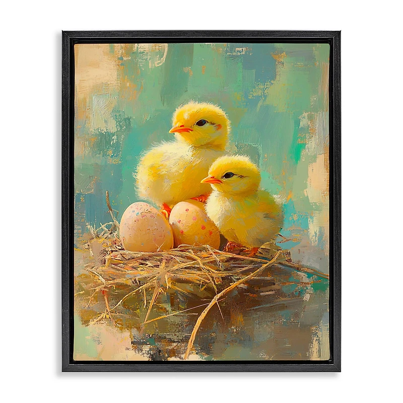 Wall art is ready to hang with hardware free hanging. For easy set up lean or layer artwork on shelf or against Wall. Artwork is permanently fixed into the frame. We use only the highest quality inks in house with industry leading printing solutions. Our elevated 1.7" thick floating frame is the perfect complement to our canvas style wall art. Canvas is hand stretched over a durable wood foundation and then mounted securely into a modern box frame. Artwork relates to chicks, nest, eggs, feathers, pastel, spring, easter, holiday. Details:Available in multiple frame colorsAvailable in multiple sizes1.7" thick floating frameMade of durable wood foundationNo installation requiredMade in the USAPerfect for indoor useDesign by Franklyn Gregory