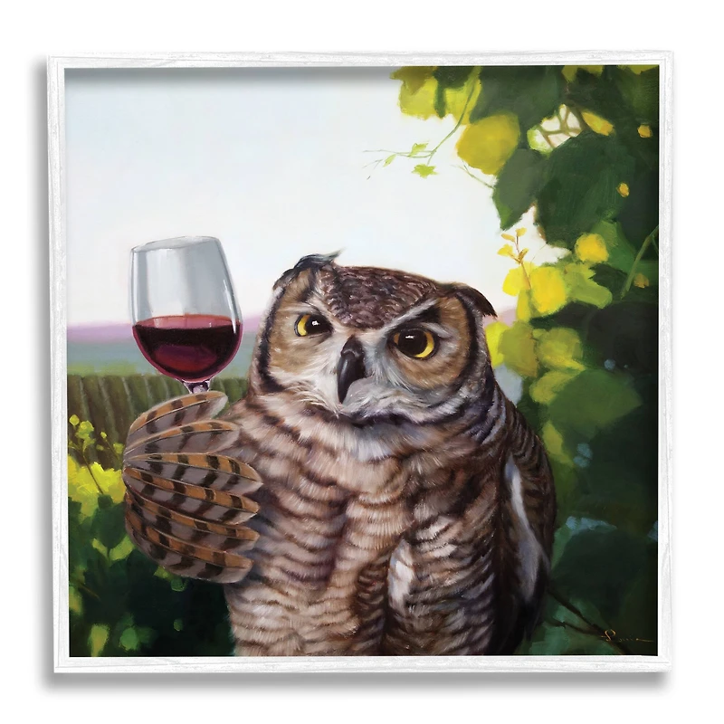 Stupell Industries Great Horned Owl Drinking Wine White Framed Wall Art