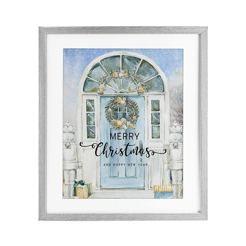 Wall art is ready to hang with hardware free hanging. No installation required. For easy set up lean or layer artwork on shelf or against wall. PETG plastic frame covering adds extra durability. A digitally printed paper is framed with a white mat under durable PETG plastic. The bevel cut mat is made of paper pulp mat board. The wood look frame includes a pre-installed sawtooth hanger for easy hanging. Artwork relates to Christmas, greeting, winter, holiday, snow, wreath, seasonal, joy, celebration, tradition.Details:Merry Christmas blue door framed printAvailable in multiple sizesDurable PETG plastic frameBevel cut mat is made of paper pulp mat boardIncludes pre-installed sawtooth hanger for easy hangingDesign by Jesse Keith