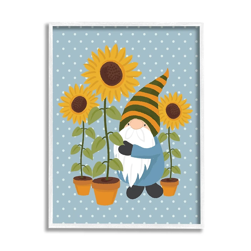 Stupell Industries Sunflower Garden Gnome Striped Hat Blue Polka Dots in White Frame Wall Art