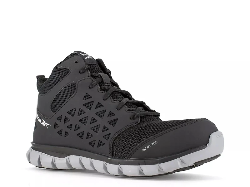 Tough and stylish, the Sublite Cushion Composite Toe work sneaker from Reebok Work is perfect for those who demand the best. Designed for lightness and flexibility, this mid-cut boot has mesh upper to ensure breathability and cooling comfort all day. The MemoryTech massage footbed adapts to your foot's contours, while the deep flex grooves in the Sublite foam midsole enhance mobility. The alloy toe and ESD rating ensure superior protection and safety in various work environments. It's finished off with an oil- and slip-resistant sole with rubber pads to provide traction where you need it most.
