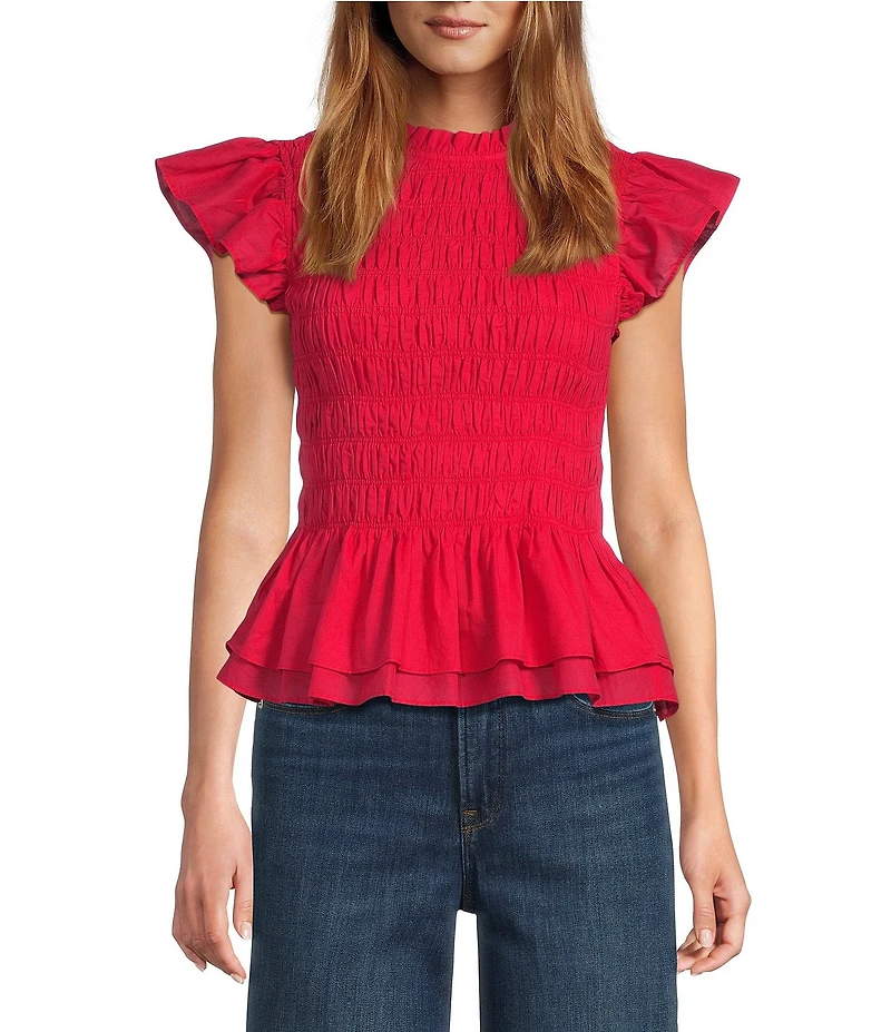 Sugarlips Petite Size Ruffle Mock Neckline Sleeveless Smocked Peplum Top in Chattanooga, TN