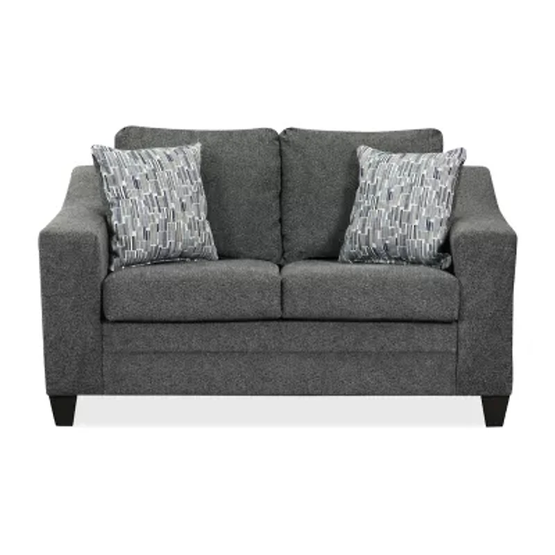 This loveseat offers sophistication to any room with its clean lines, sloped track arms, and the pair of contemporary toss pillows. Enjoy this piece with confidence and comfort. Offered in three colors. Proudly made in the USA.