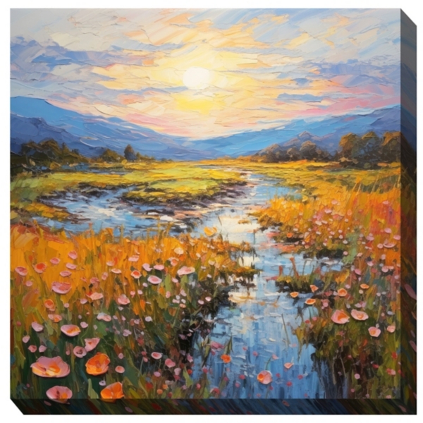 Our Summit Creek Outdoor Canvas Art Print illustrates a stunning sunset view. With its soft pink undertones, this print will gorgeously compliment similarly colored décor. Overall dimensions Width: 24 in. Depth: 1.5 in. Height: 24 in. Giclee printed on a stretched, polyester canvas Wrapped edges complete the look Features a landscape subject Hues of blue, orange, pink, green, yellow, and white Weight: 3.6 lbs. UV resistant and waterproof Outdoor safe Made in China Hangs from back-mounted hardware Care: Dust with a soft, dry cloth. This item is available at Kirklands.com only, not available in stores. Please note: this item cannot be shipped to APO/FPO addresses.