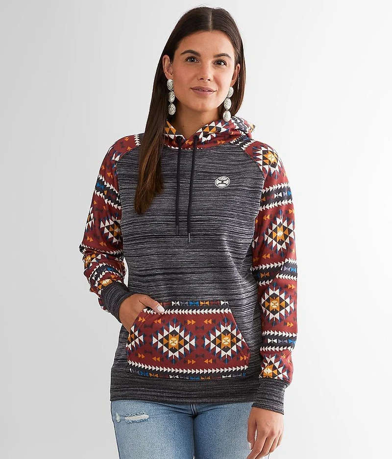 Embroidered logo marled hoodie Southwestern print contrast hood, raglan sleeves and pouch pocket Bust measures 40" on size small Body length 26" on size small