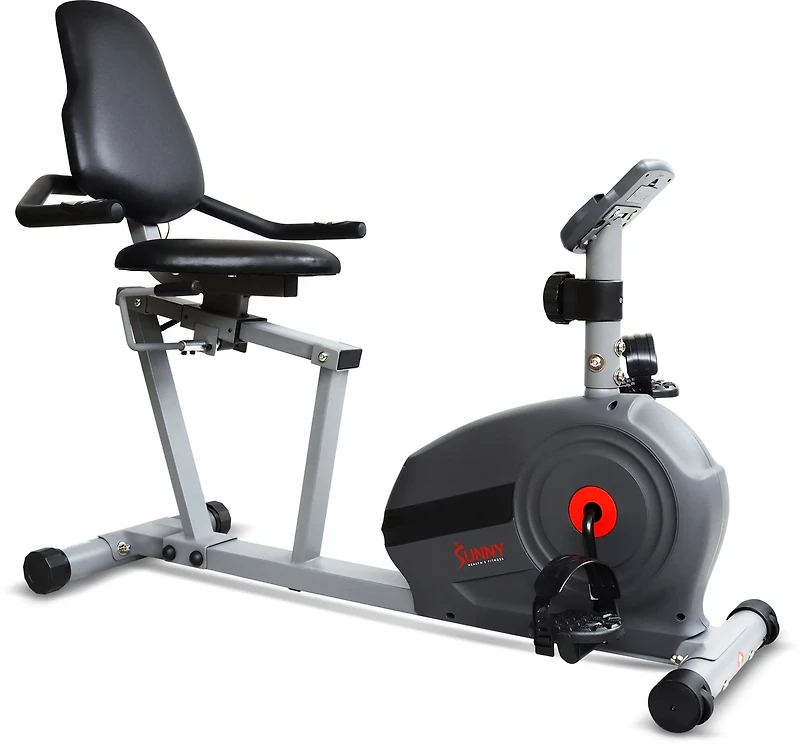 Exercise at home with the Sunny Health & Fitness Essential Series Magnetic Smart Recumbent Bike. This recumbent bike features a heavy high-inertia flywheel that offers smooth contactless resistance and a digital monitor that lets you see speed, time, distance, calories and more. Connect to SunnyFit® app via Bluetooth for workouts and live metrics.
