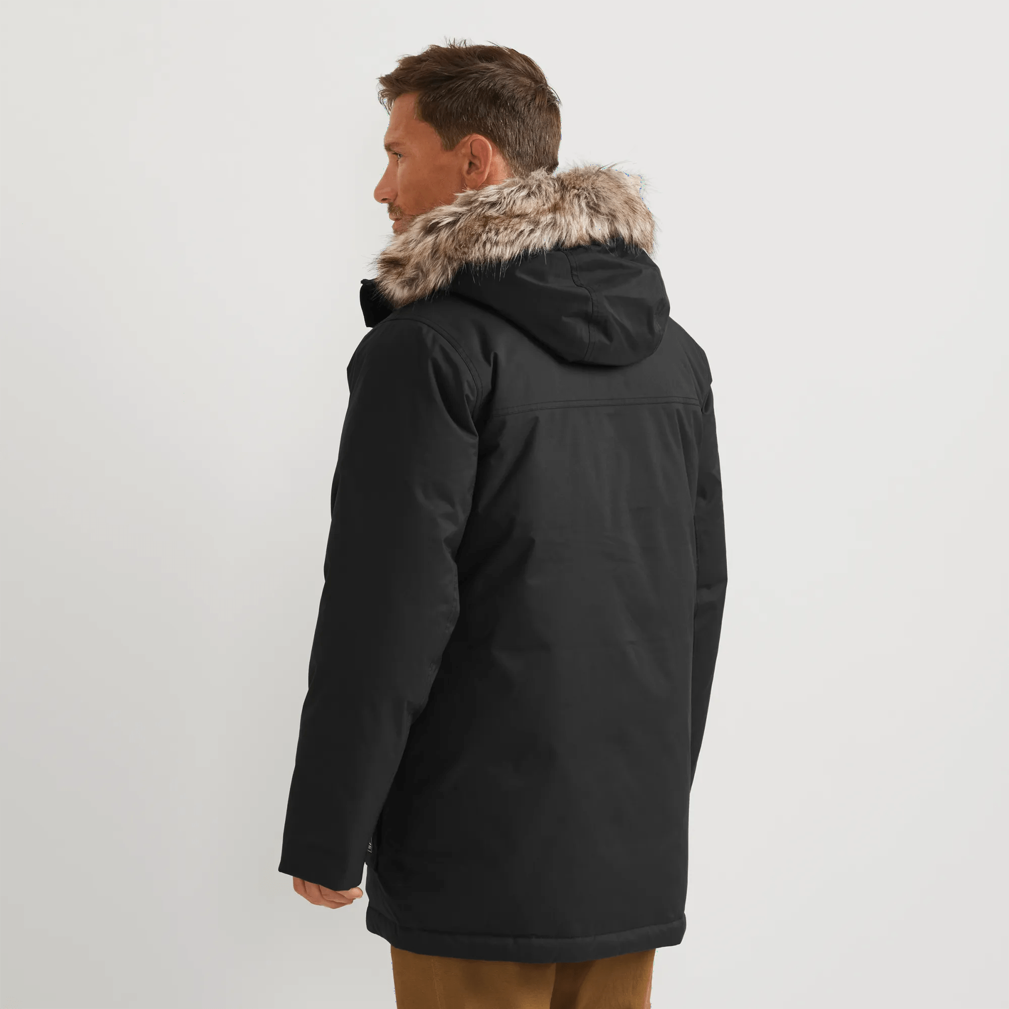 - Attached, adjustable hood with removable faux fur ruff
