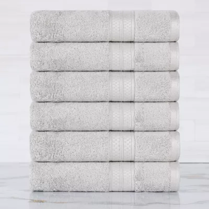 Elevate your everyday routine with this 6-piece Hand Towel Set, crafted from a plush blend of 60% cotton and 40% rayon from bamboo. Naturally soft, breathable, and ideal for sensitive skin, these heavyweight towels absorb moisture quickly while offering a silky-smooth feel. Each solid towel features a coordinating border and a built-in hanging loop for easy drying. Set includes six (6) hand towels, each measuring 16" x 30", available in a range of timeless and modern colors. OEKO-TEX certified for safety and sustainability. Soft. Absorbent. Effortlessly refined.