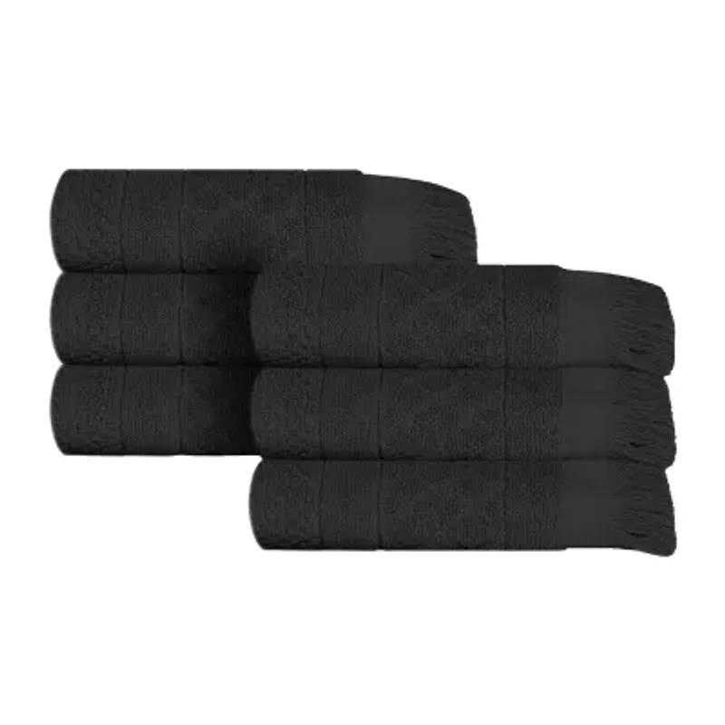 Practical and stylish, the Rolla Cotton Geometric Hand Towel Set of 6 adds softness and function to your everyday routine. Made from absorbent cotton with a geometric jacquard design, each towel features frayed edges and a hanging loop for convenience. Set includes six hand towels, 16" x 30" each. Available in Sage, Peach, Chocolate, Silver, White, Ivory, Blue, Black, and Grey. OEKO-TEX certified for safety and sustainability. Machine wash cold, tumble dry low. Functional. Plush. Modern.