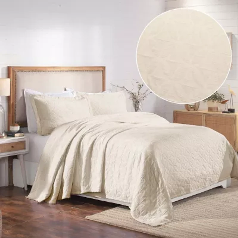 Infuse your bedroom with timeless elegance with this Serenity Bedspread Set, including one bedspread and matching pillow sham(s). Made from 100% breathable cotton, the raised jacquard weave features a sculpted Celtic circle pattern for rich texture and visual appeal. Lightweight and comfortable, it's perfect for layering year-round. Shams mirror the bedspread's design and include envelope closures for a polished finish. OEKO-TEX� certified and machine washable for everyday ease. King: 120" x 120" bedspread, 20" x 36" shams, Queen: 102" x 120" bedspread, 20" x 26" shams, Full: 96" x 110" bedspread, 20" x 26" shams. Twin: 81" x 110" bedspread, 20" x 26" sham. Classic. Sculpted. Elegant.