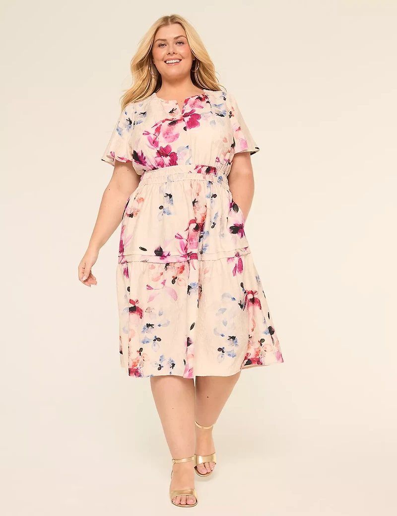 Available in Plus Size This midi dress with smocked waist and eye catching floral print will give a spring vibe to your look. FIT: Fit & Flare. Universally flattering silhouette with a classic fit bodice, fitted waist and flared skirt. Front Length (On Body): 48" (hits mid to lower calf) Midi length FEATURES: Surplice neck Short sleeves Smocked waist FABRIC: Soft fabric Machine Wash Cold With Like Colors Gentle Cycle Only Non-Chlorine Bleach When Needed Tumble Dry Low Cool Iron If Needed SHELL:97% POLYESTER 3% SPANDEX Item Number #415007 Imported Plus Size Dress ". Plus Size Surplice Neck Smocked Waist Tiered Dress, in Multi Floral, 14/16, Women's, Lane Bryant